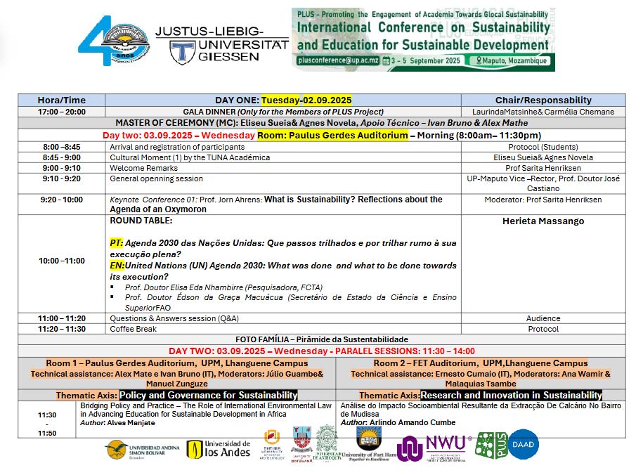 The conference agenda will include keynote presentations, panel discussions, and interactive workshops addressing key themes such as climate resilience, sustainable pedagogy, curriculum integration, and community-based sustainability initiatives. Participants will explore best practices in ESD implementation, innovative teaching methodologies, and policy frameworks that support sustainability in education. Special sessions will highlight regional challenges and opportunities, enabling institutions like UP-Maputo in the Latin American and Southern African regions as well as in Europe to tailor strategies that align with local contexts. The conference will also facilitate networking opportunities for researchers and practitioners, fostering long-term collaborations that drive impactful change in sustainability education.